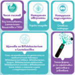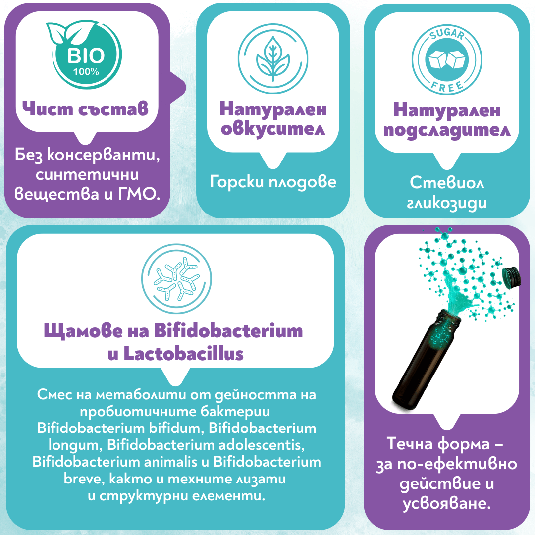 Състав: Смес на метаболити от дейността на пробиотичните бактерии B. bifidum, B. longum, B. adolescentis, B. animalis и B. breve, както и техните лизати и структурни елементи.